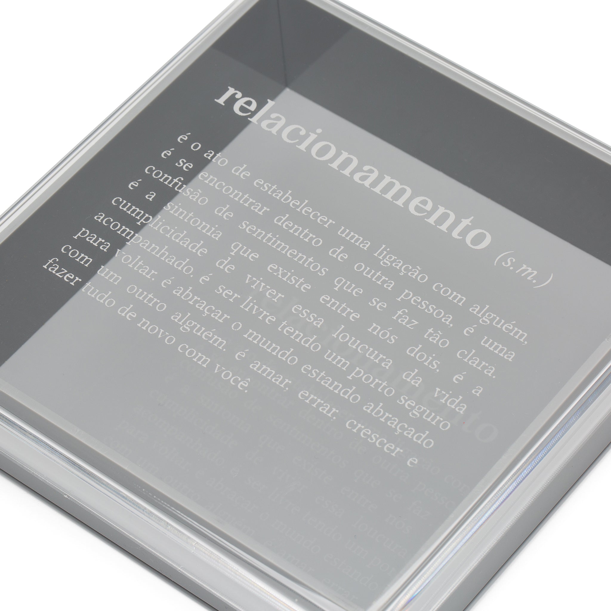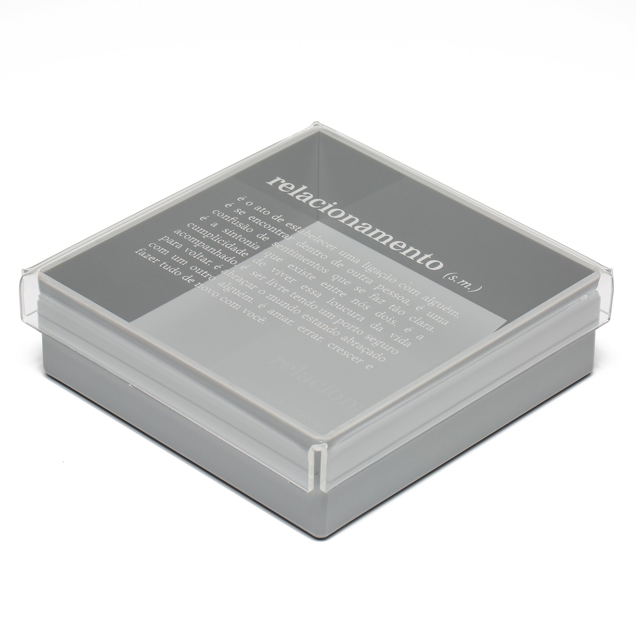 A Box da artminds surgiu da necessidade de ter uma caixa coringa para presentear ou usa-lá como desejar. Feita em acrílico cinza e com a tampa transparente é perfeita para todos os momentos. A tampa é feita no acrílico transparente e o fundo da caixa pode ser no acrílico cinza, preto ou transparente.