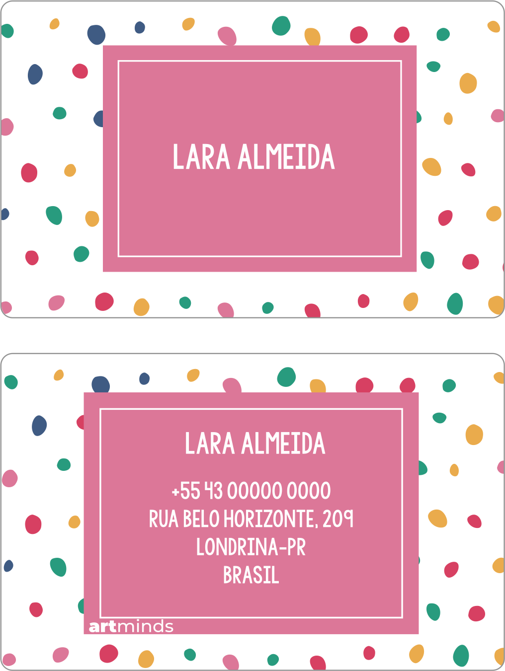 - Verso: nome, telefone, e-mail ou endereço, cidade e país (escolha as informações importantes para você, o uso de todas não é obrigatório)