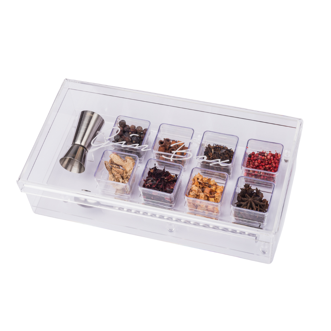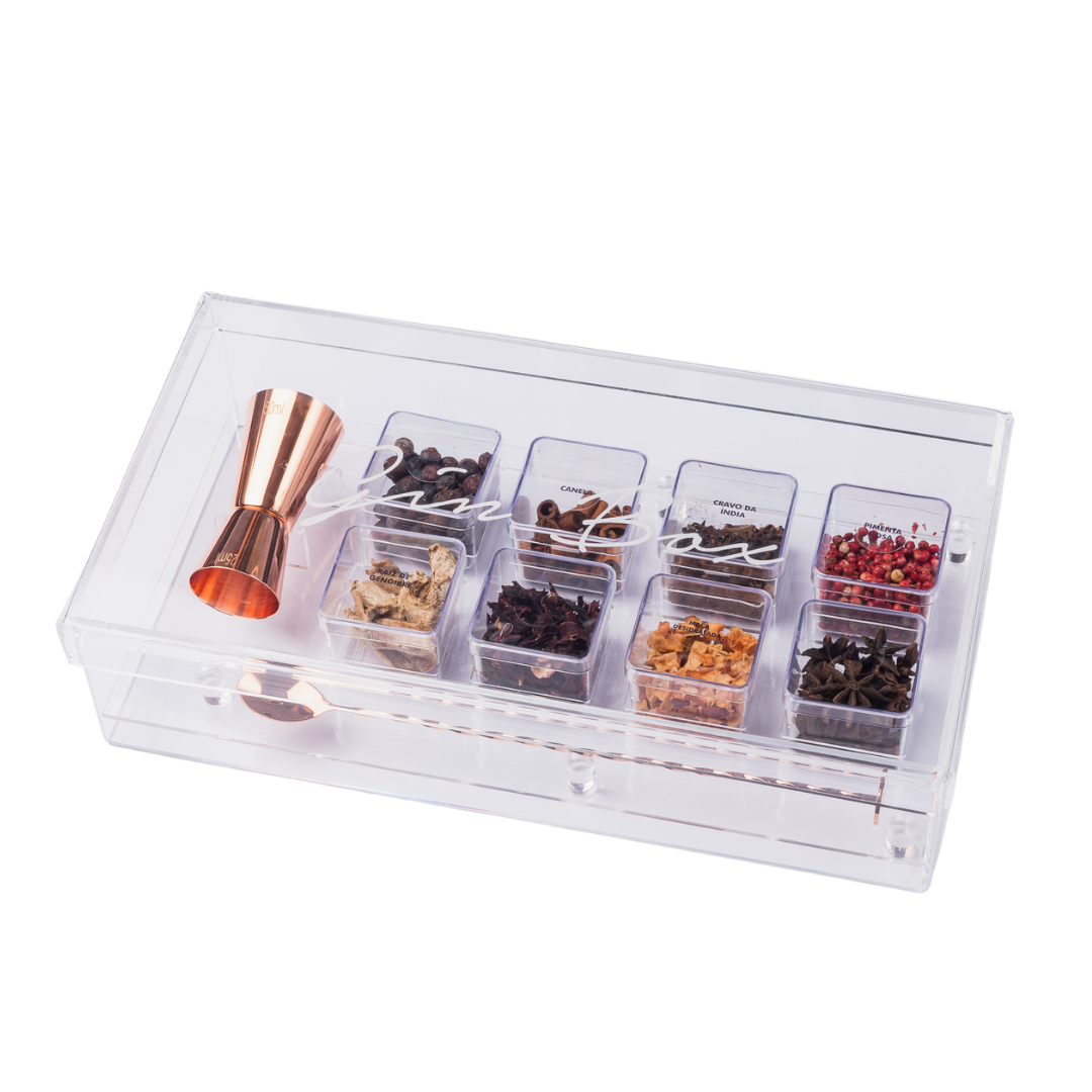 A Ginbox da artminds foi pensada para quem aprecia muito mais do que um simples gin tônica. Idealizada para os amantes dessa bebida, a Ginbox se faz completa em todos os sentidos. Produzida em acrílico, podendo ter suas inciais ou sobrenome jateadas na tampa, tornando-se única e exclusiva. Acompanha oito especiarias, uma colher bailarina e um dosador no material de sua escolha, tudo pensado para preparo desse drink que ganhou o coração de todos!