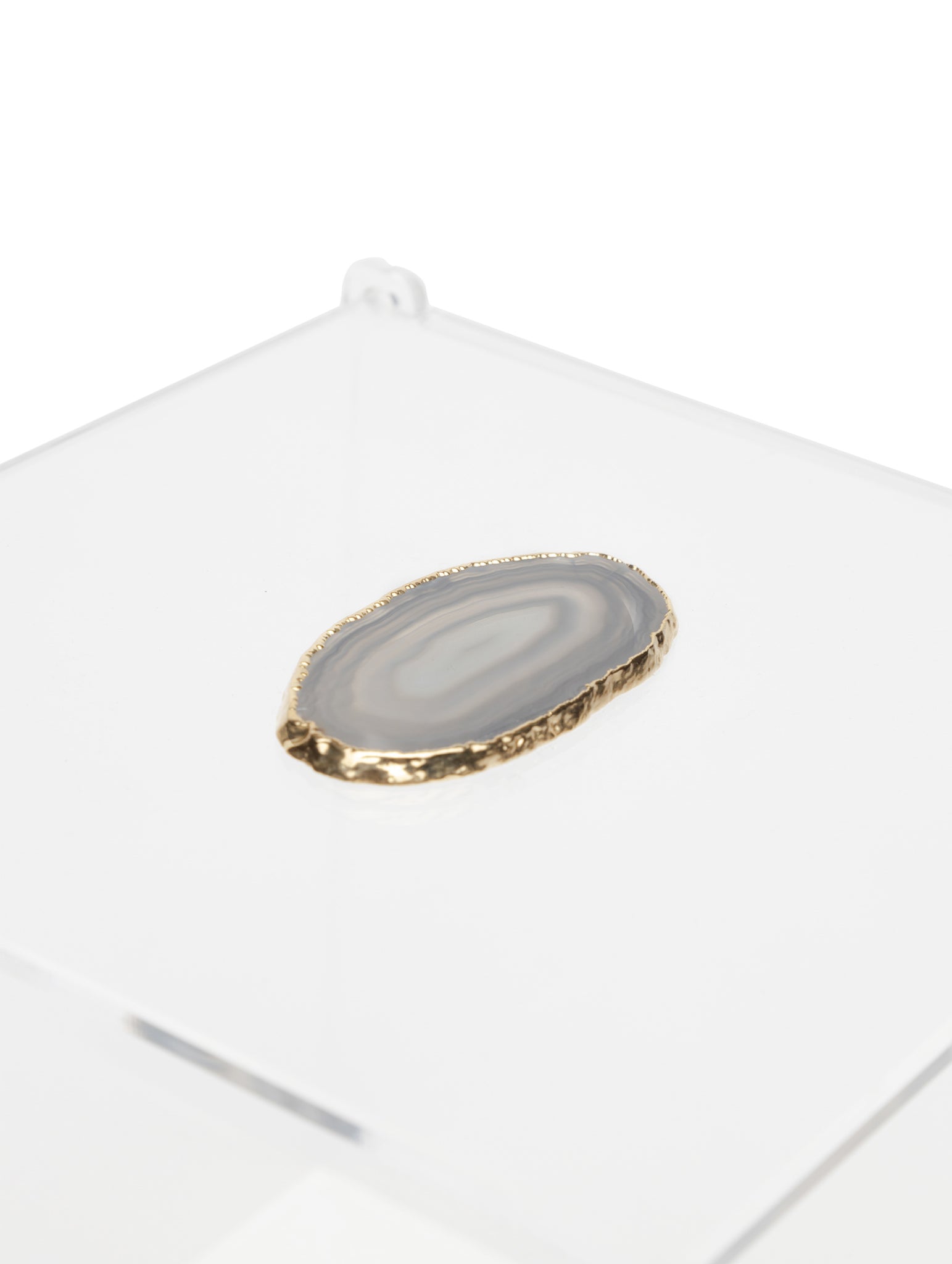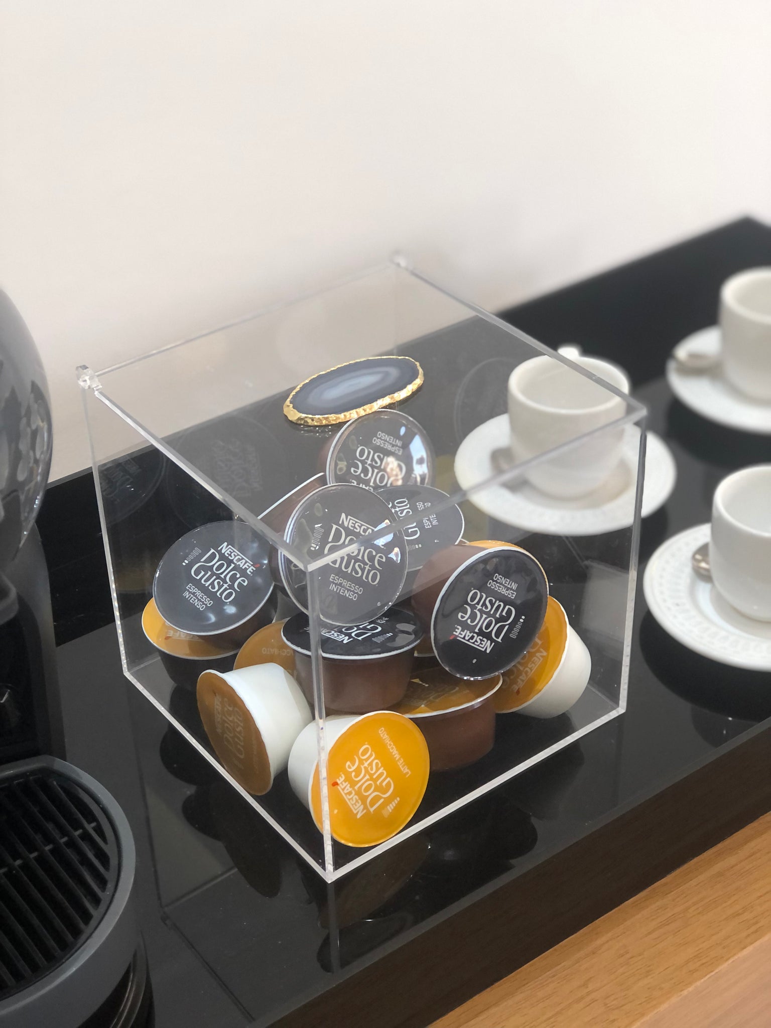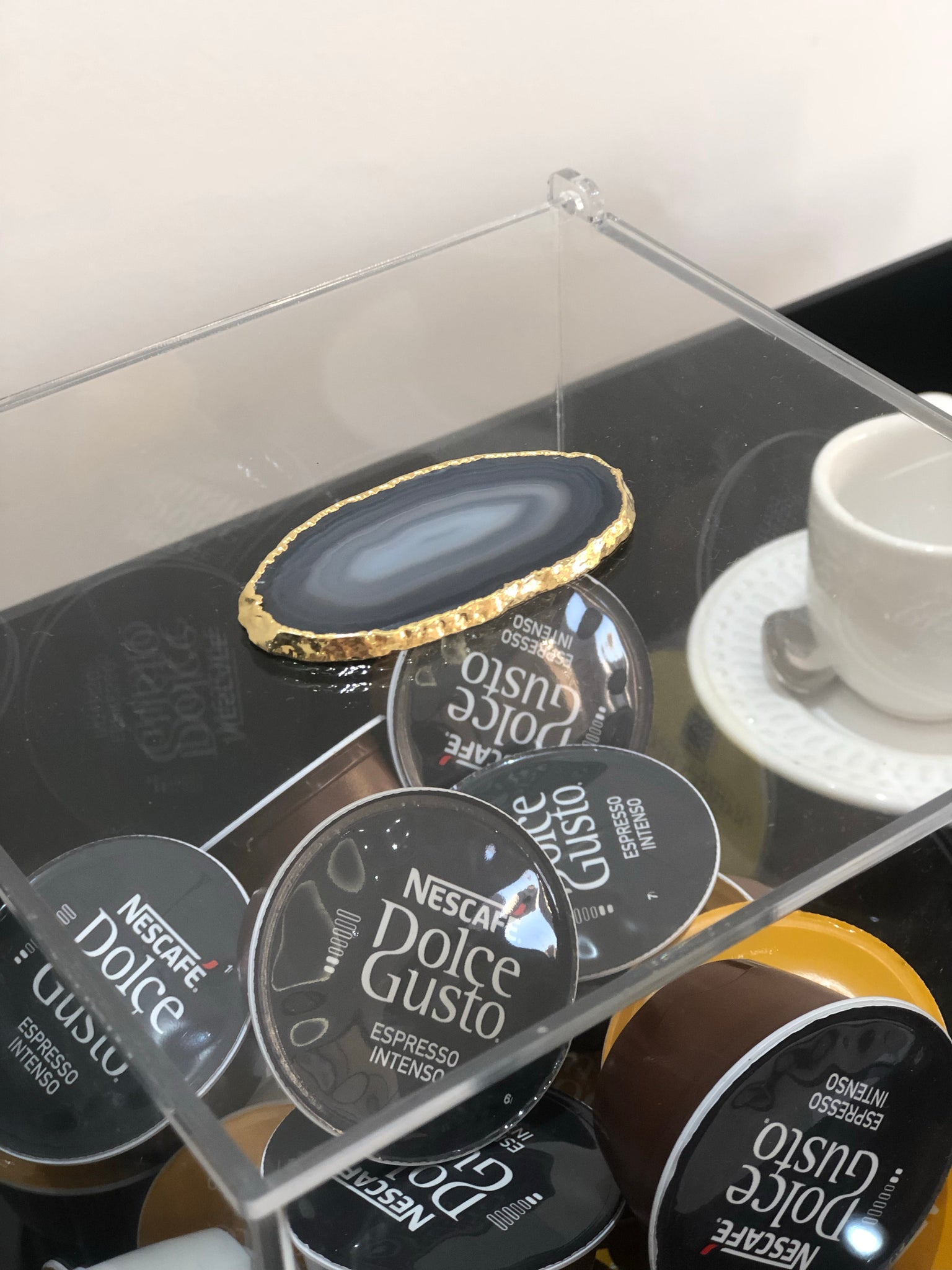 A Caixa Cápsulas - Pedra Ágata da artminds surgiu da necessidade de ter uma caixa coringa para armazenar suas cápsulas de máquina de café com muito mais estilo e bom gosto. A caixa pode ser usada de diversas maneiras, em todos os cômodos da casa, basta usar sua imaginação e necessidade. Feita inteira em acrílico transparente, a Pedra Ágata natural colada na tampa deixa a caixa mais linda e charmosa. A tampa por ser grudada na caixa e levantar até a metade, também se torna um diferencial.