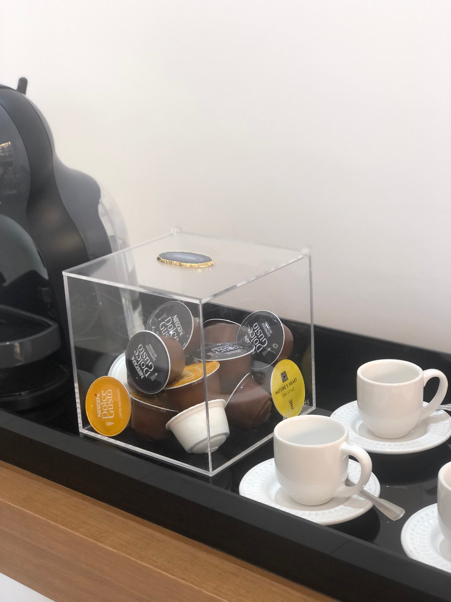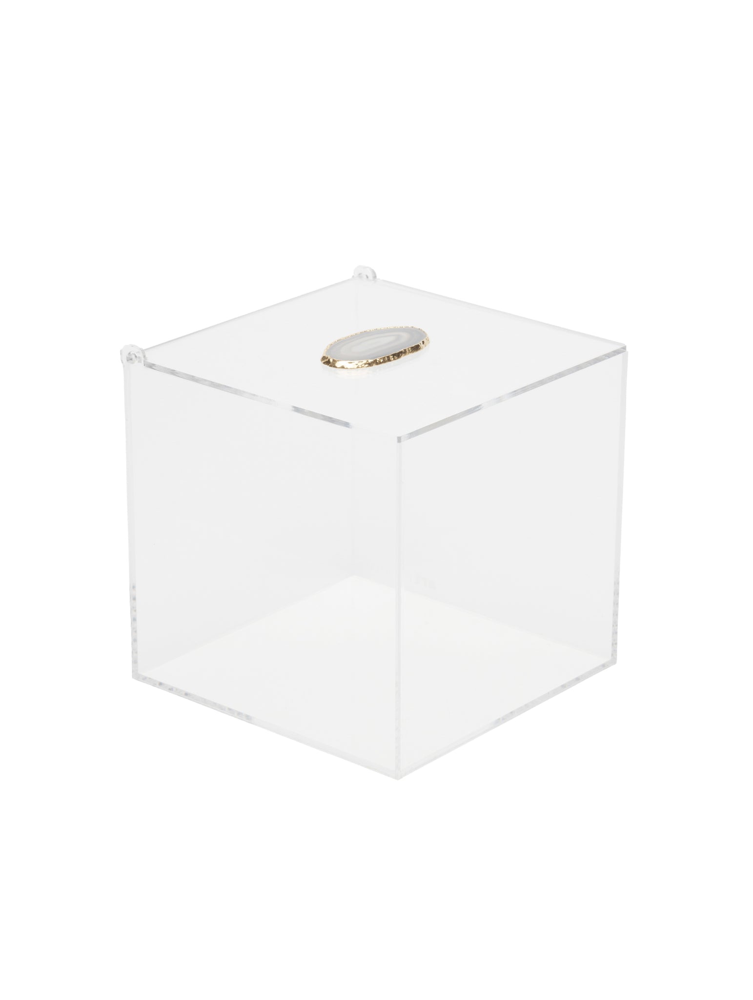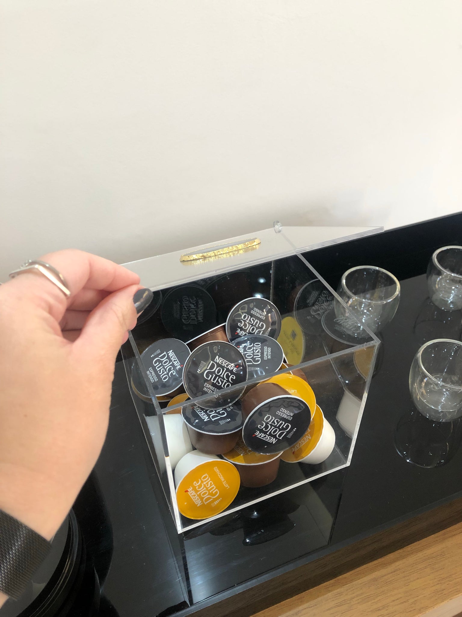 A Caixa Cápsulas - Pedra Ágata da artminds surgiu da necessidade de ter uma caixa coringa para armazenar suas cápsulas de máquina de café com muito mais estilo e bom gosto. A caixa pode ser usada de diversas maneiras, em todos os cômodos da casa, basta usar sua imaginação e necessidade. Feita inteira em acrílico transparente, a Pedra Ágata natural colada na tampa deixa a caixa mais linda e charmosa. A tampa por ser grudada na caixa e levantar até a metade, também se torna um diferencial.
